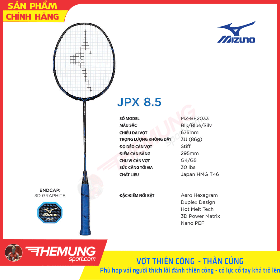 - Thứ 3 là Vợt cầu lông Mizuno JPX 8.5: Ngay từ khi mới ra mắt, JPX 8.5 đã chiếm trọn tình cảm và sự hâm mộ của giới cầu lông, đặc biệt là những tay vợt chuyên công.