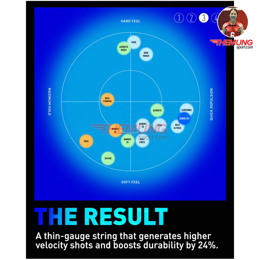 - Bằng cách sử dụng cùng một vật liệu cho hai loại cước đường kính nhỏ bao gồm Yonex BGXB 63, thực nghiệm cho thấy độ bền được cải thiện 24% so với các sản phẩm thông thường, đồng thời đạt được cả khả năng phục hồi và độ bền khá cao mặc dù chỉ 0,63 mm. Ngoài ra, khả năng chèn sâu 7 cm về phía địch thủ với âm thanh đánh cao cùng với những cú đánh tốc độ ngăn chặn phản công của đối phương và đưa trận đấu có lợi thế.