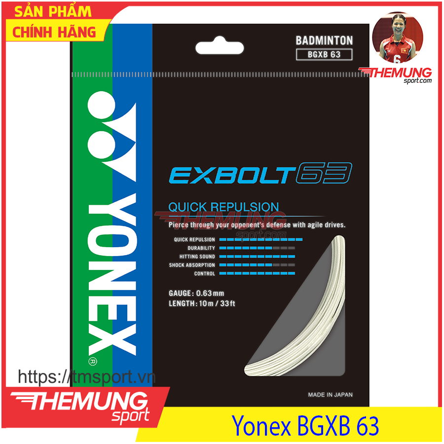 - Loại dây đan vợt cầu lông Yonex BGXB 63 - EXBOLT 63 này thuộc top các loại dây siêu cao cấp, thiên về lực đẩy, đánh sướng với tiếng nổ to như Yonex BG 66U, Yonex BG66B, Yonex Nanogy 98,...Đảm bảo đến lúc em nó trình làng trên Thế giới sẽ tạo ra một cơn địa chấn cực lớn.