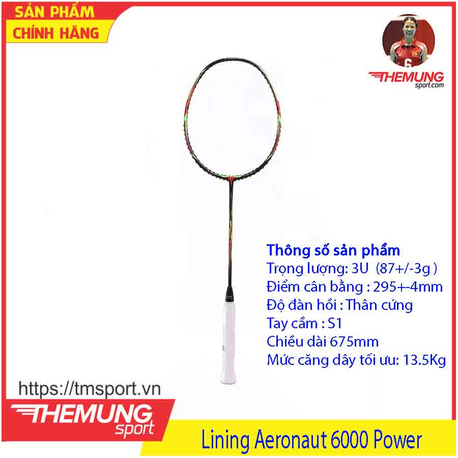 - Vợt cầu lông Lining Aeronaut 6000 Power khi đọc tên thôi là đã biết ngay cây vợt này sinh ra dành cho những bạn yêu thích lối chiên thiên về sức mạnh, đặc biệt vợt cũng là phiên bản màu mới của Aeronaut 6000C có trọng lượng 87g, điểm cân bằng 295mm cùng đũa vợt có độ cứng ở mức trung bình hỗ trợ cực tốt cho những quả smash cầu cháy sân.